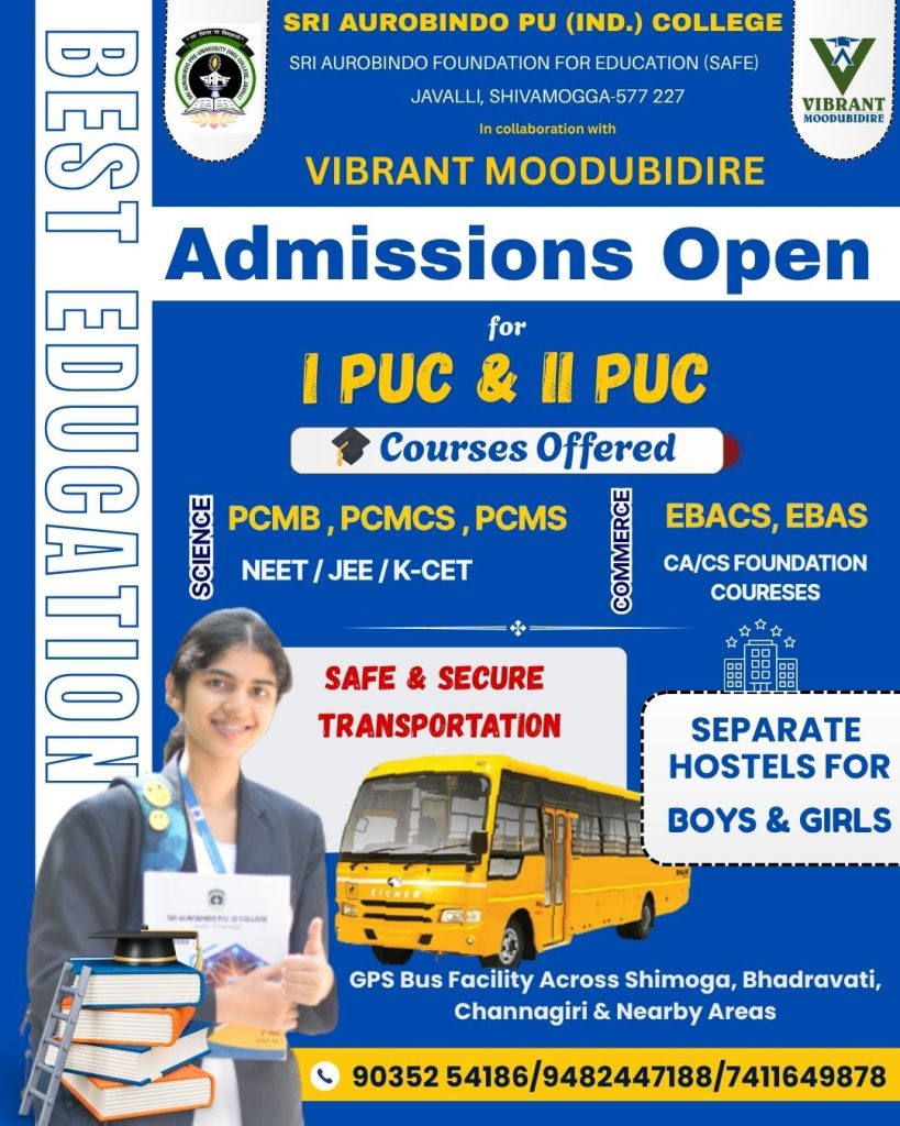 Sri Aurobindo PU College has been part of the Shivamogga education since 2001, founded by Jnanadeepa Vidya Samsthe with a focus on all-round student development. It already had the infrastructure, the community trust, and the institutional standing. What the partnership with Vibrant Academy Moodubidire adds is an integrated coaching system— the same one that has been producing Karnataka toppers from Moodubidire.