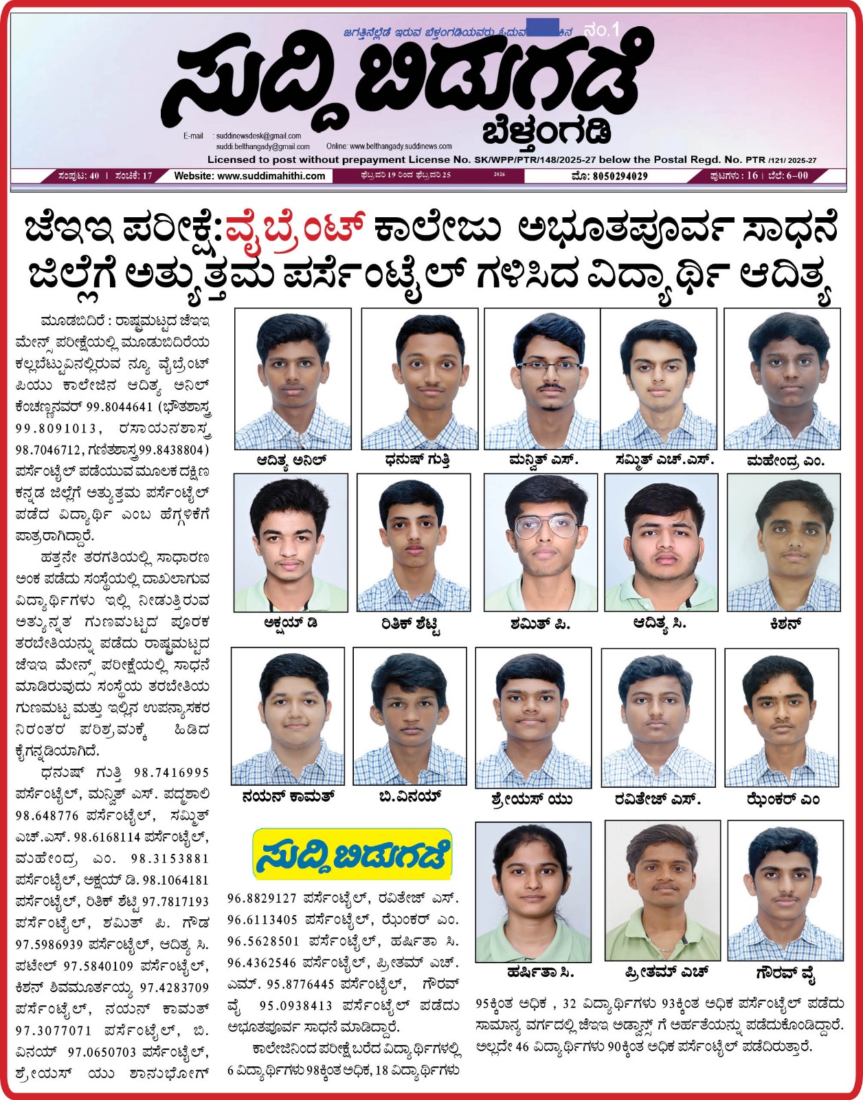 TOP AND BEST JEE MAINS RESULTS-2026 IN DAKSHINA KANNADA