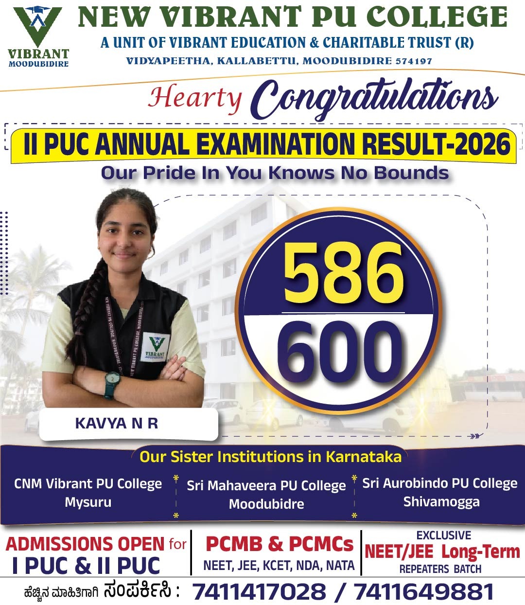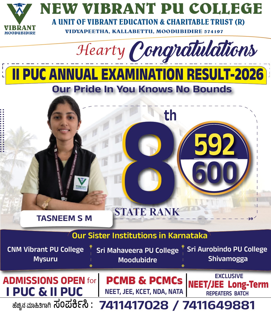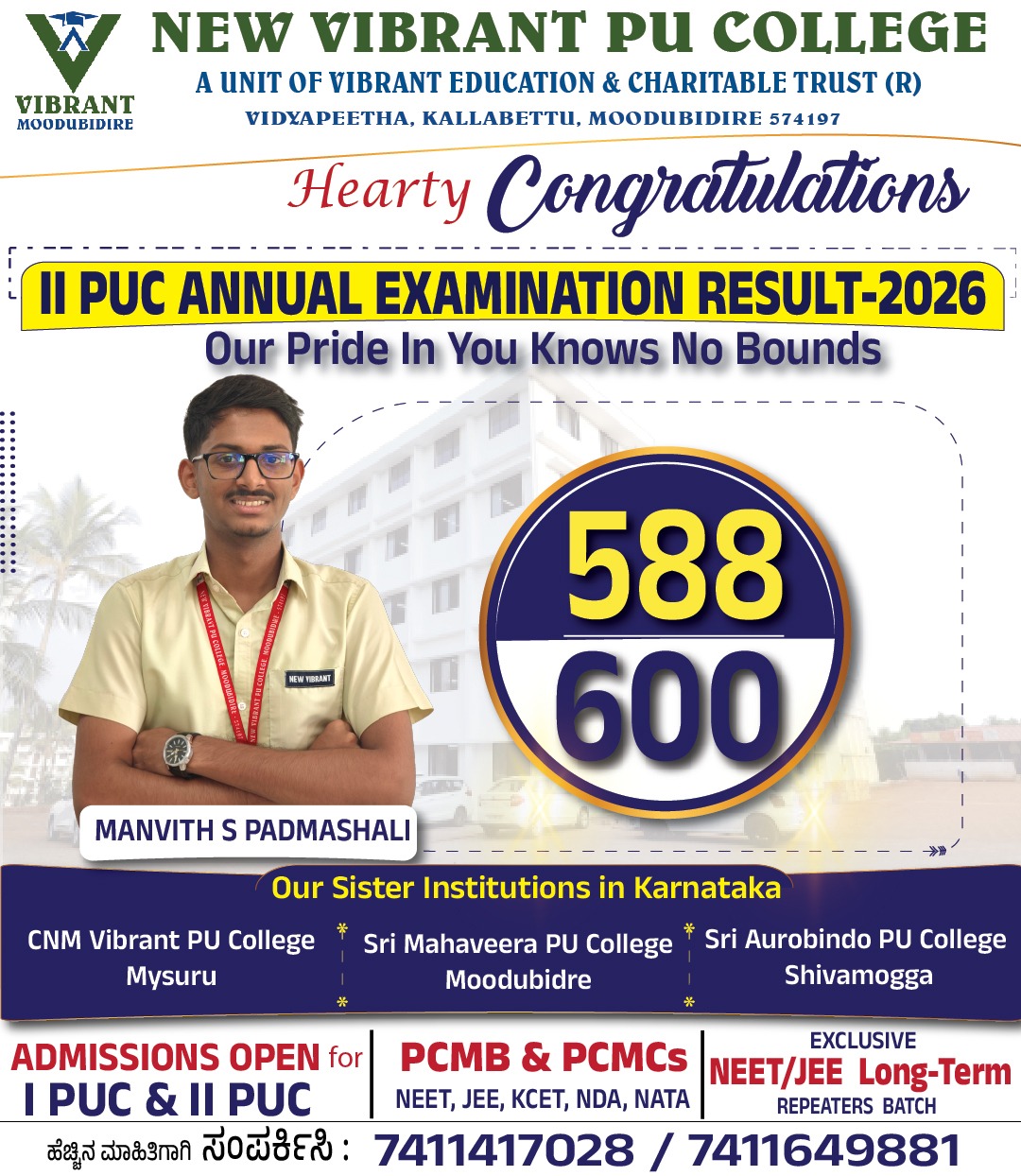 TOP AND BEST PU BOARD RESULTS IN KARNATAKA, NEW VIBRANT PU COLLEGE, MOODUBIDIRE, MANGALORE