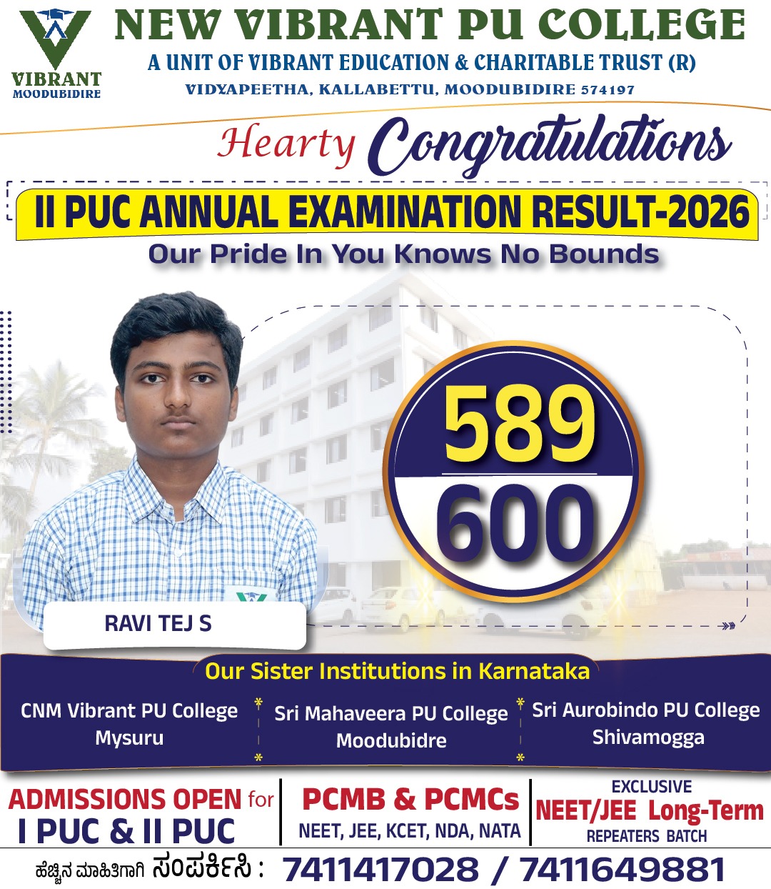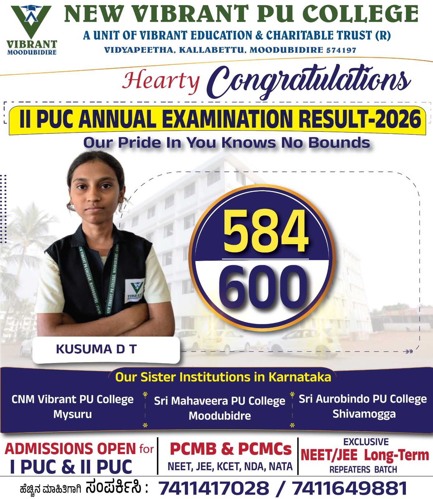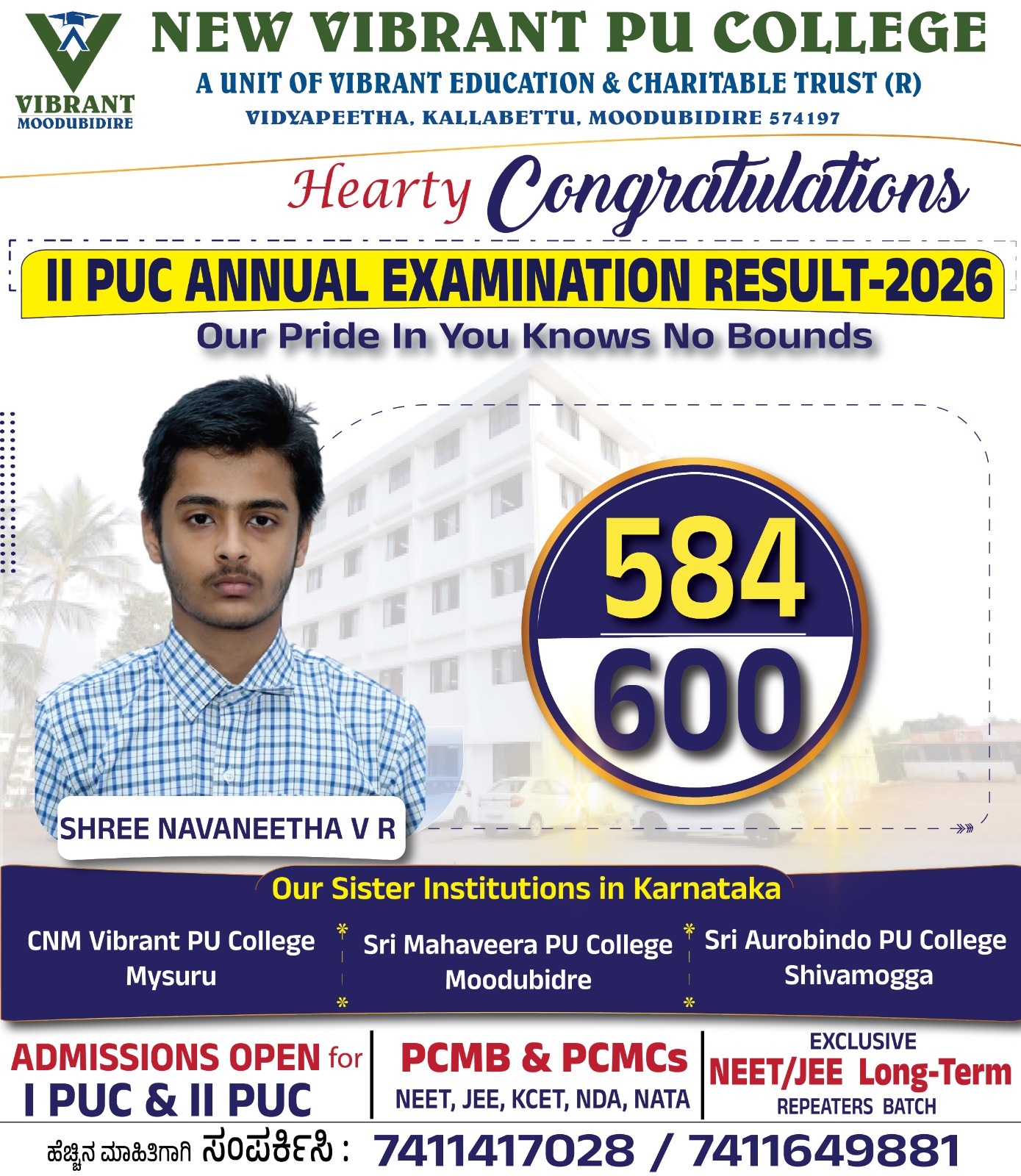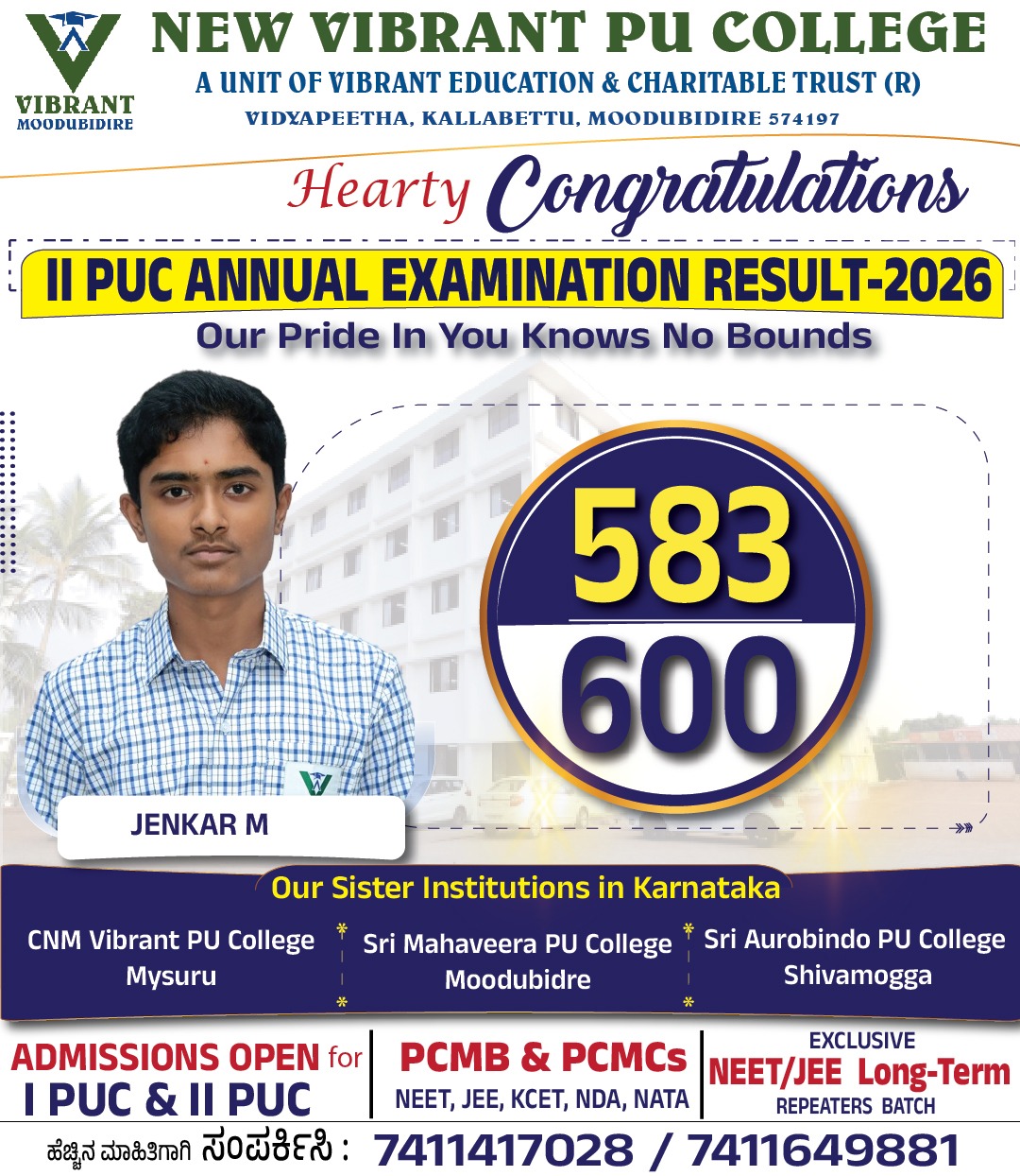 TOP AND BEST PU BOARD RESULTS IN KARNATAKA, NEW VIBRANT PU COLLEGE, MOODUBIDIRE, MANGALORE